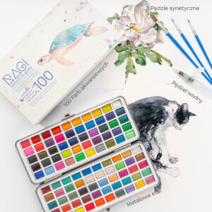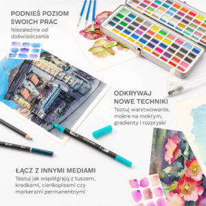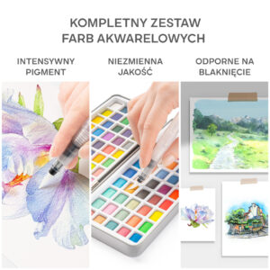 • Szeroka gama kolorów – zestaw farb akwarelowych obejmuje klasyczne, metaliczne, fluorescencyjne i pastelowe odcienie.
