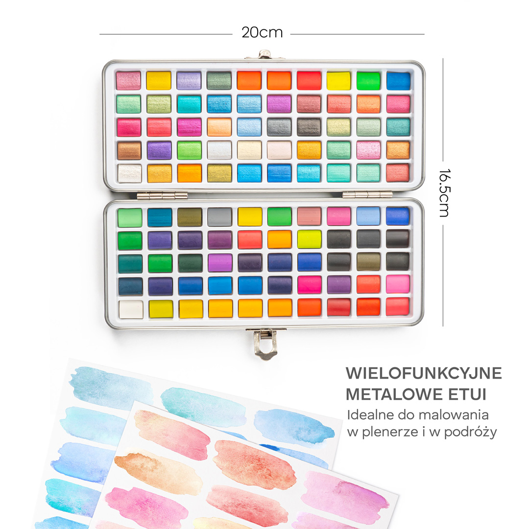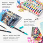 • Szeroka gama kolorów – zestaw farb akwarelowych obejmuje klasyczne, metaliczne, fluorescencyjne i pastelowe odcienie.