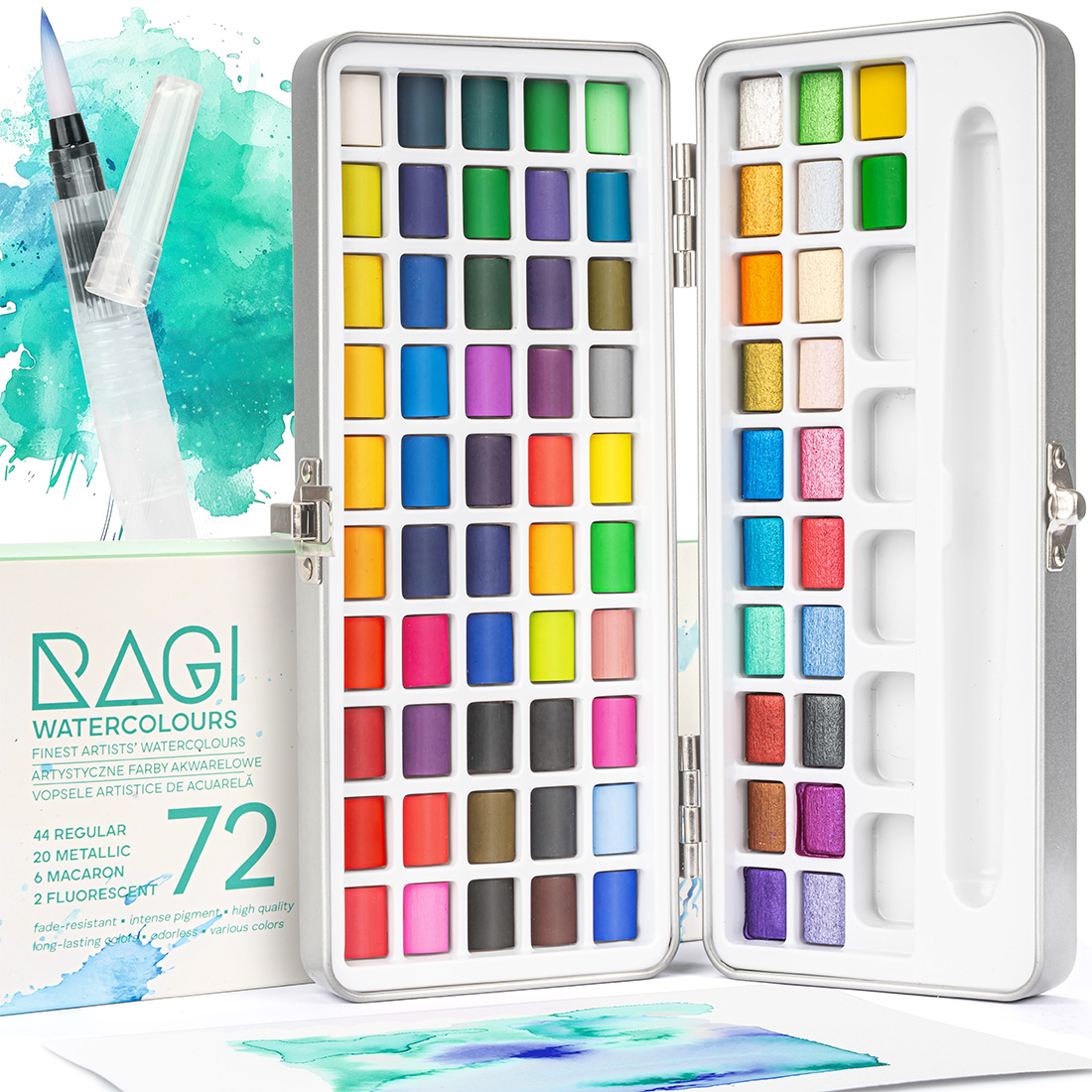 Zestaw akwareli RAGI to 72 intensywne kolory zamknięte w lekkim, eleganckim etui. Dzięki temu możesz malować wszędzie – w domu, w szkole czy na wycieczce. Farby są wydajne, łatwo się rozprowadzają i dają piękne, żywe efekty nawet jeśli dopiero zaczynasz swoją przygodę z akwarelami.
