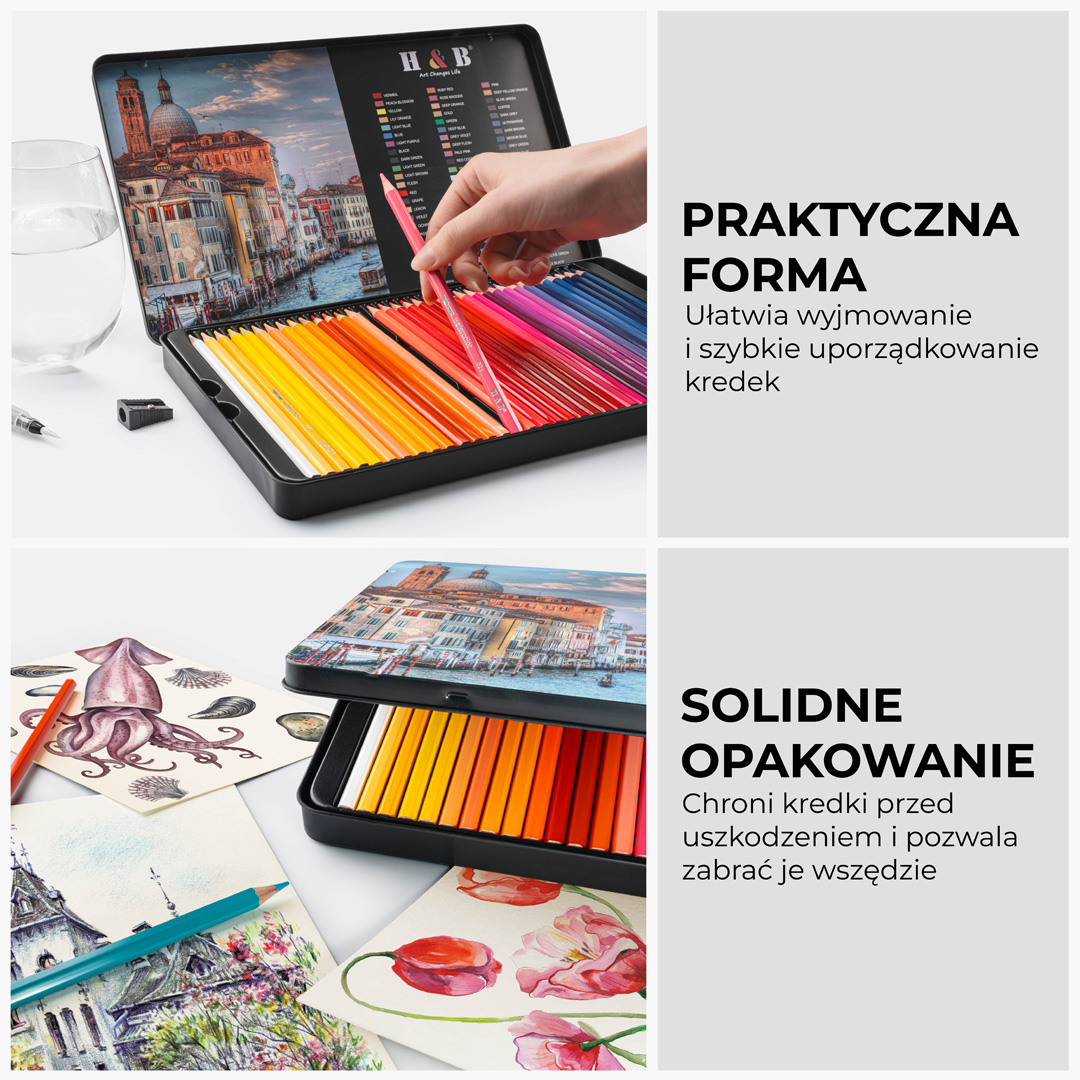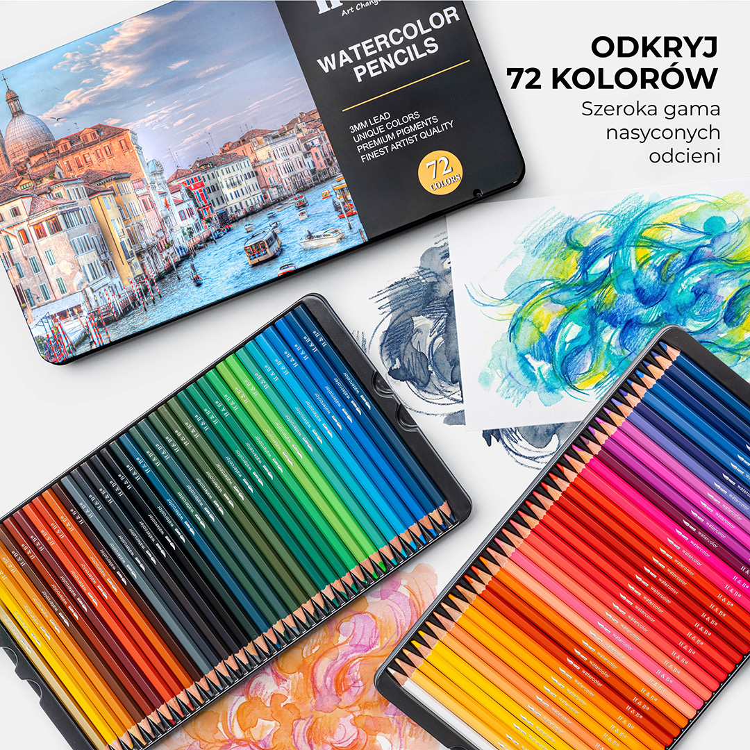 Profesjonalna gama 72 kolorów, która umożliwia płynne przejście od klasycznego szkicu do efektownej akwareli. Bogactwo pigmentu zapewnia intensywność barw nawet po użyciu wody, a dołączony pędzelek i solidne metalowe etui sprawiają, że to kompletny zestaw gotowy do pracy w każdych warunkach.