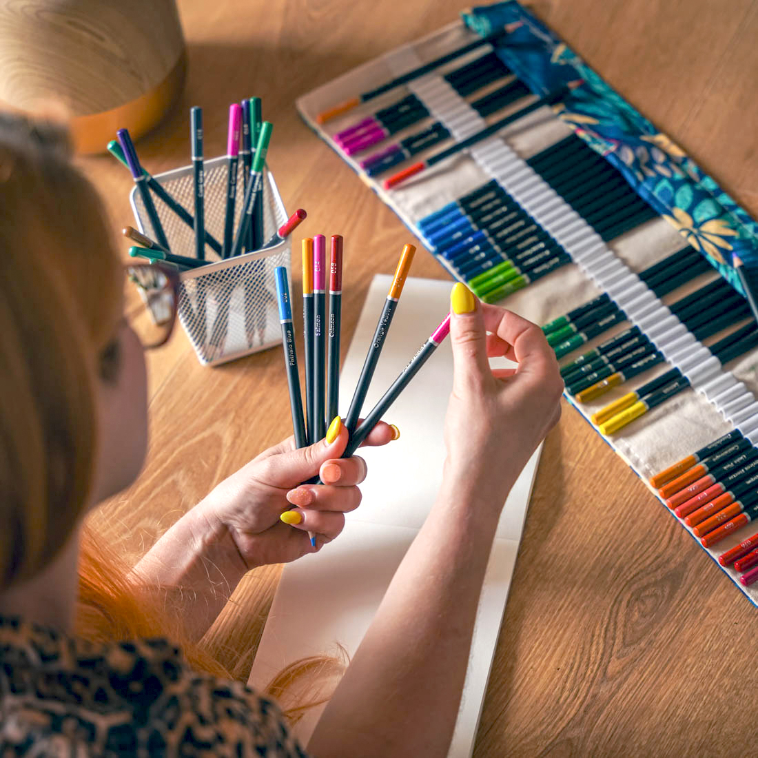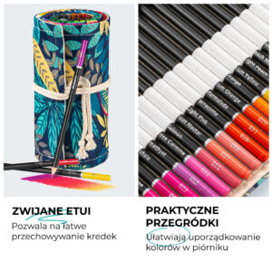 Całość zamknięta jest w stylowym, zwijanym piórniku, który chroni Twoje kolory i pozwala zabrać wszędzie ze sobą.