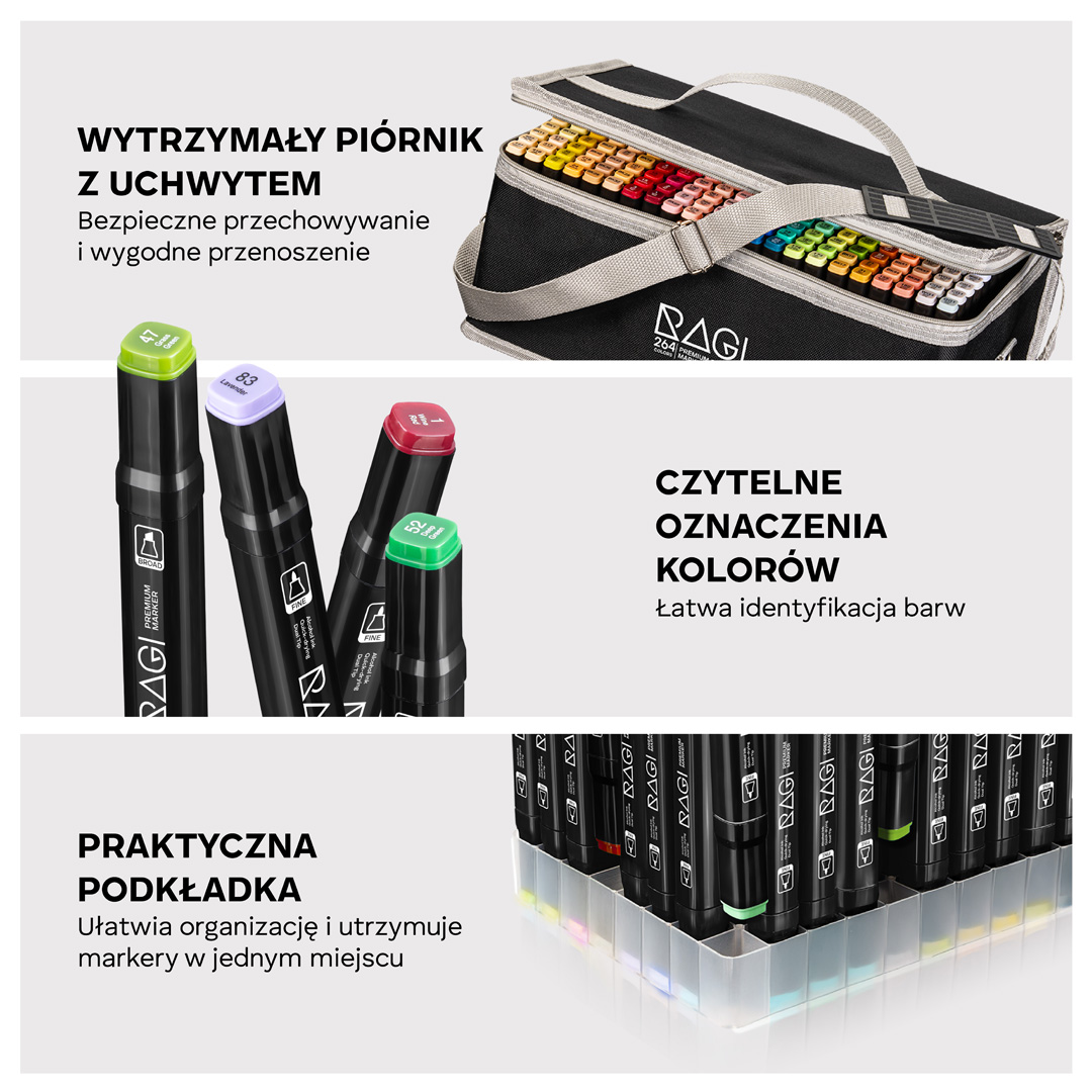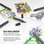 Markery Alkoholowe 262 sztuk Dwustronne – duży zestaw zestaw dla profesjonalnych rysowników oraz hobbystów. Dzięki wysokiej jakości tuszom alkoholowym, markery zapewniają gładkie i precyzyjne pokrycie, umożliwiając tworzenie zarówno prostych szkiców, jak i złożonych ilustracji.