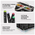- PONUMEROWANE – każdy pisak jest oznaczony numerem i nazwą koloru, dzięki czemu zachowasz porządek oraz zaplanujesz kolorystykę pracy. Z kolei miękkie etui z podstawką zapewnia łatwe przechowywanie i komfort. Organizer na markery z funkcjonalnym paskiem gwarantuje również wygodę użytkowania w dowolnym miejscu.