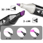 Rysik o szerokości 6 mm sprawdzi się podczas wypełniania większych powierzchni oraz przy grubych konturach. Końcówka o grubości 3 mm lepiej nada się do konturowania i wykańczania ilustracji. Każdy pisak umożliwia narysowanie linii mieszczącej się w zakresie od 0,5 – 7 mm grubości.