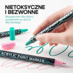 Twórz trwałe dekoracje na szkle, ceramice i drewnie dzięki zestawowi 36 markerów akrylowych! Dwie różne końcówki w każdym pisaku dają pełną kontrolę, a 3 dołączone kamienie pozwalają zacząć zabawę natychmiast.