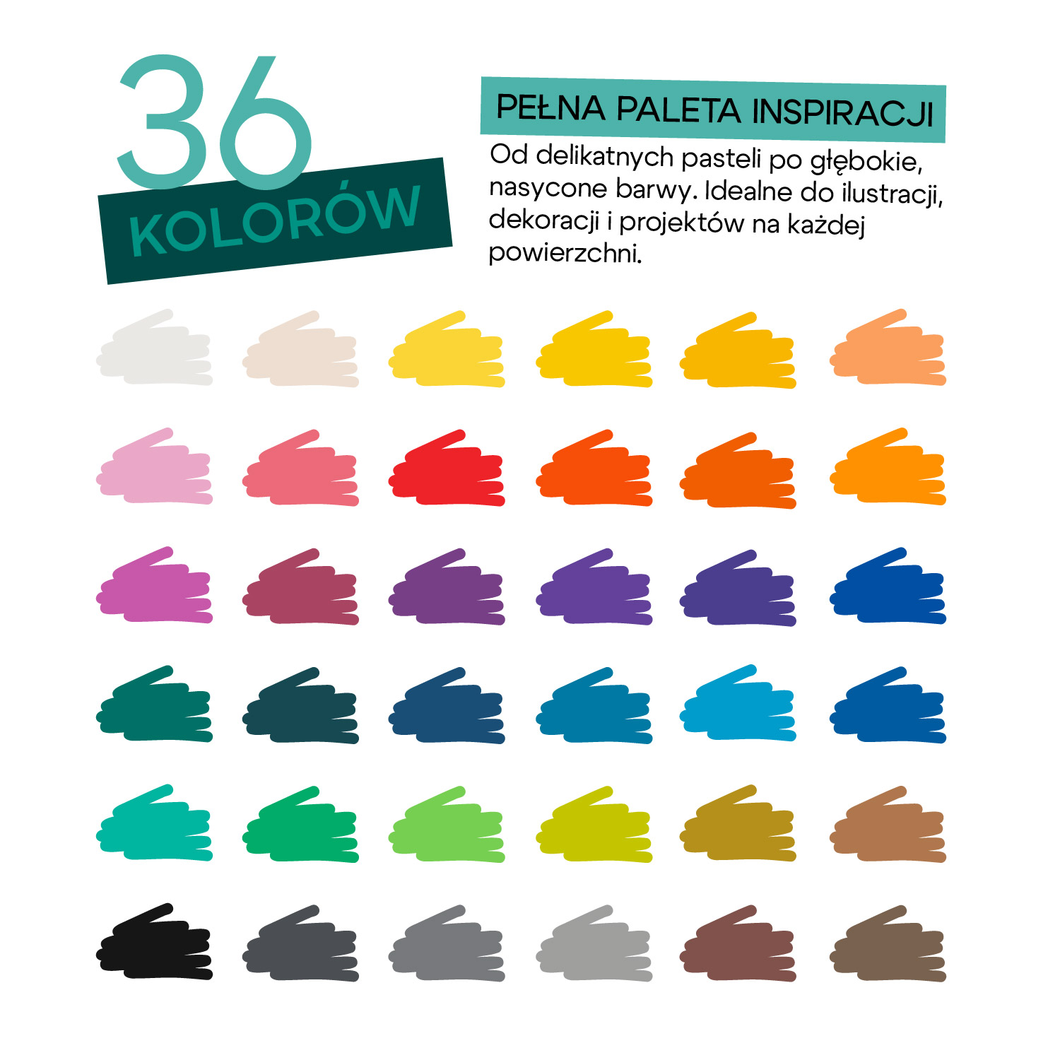W zestawie aż 36 żywych i intensywnych kolorów. Dzięki nim możesz swobodnie rysować, cieniować i tworzyć niepowtarzalne wzory.