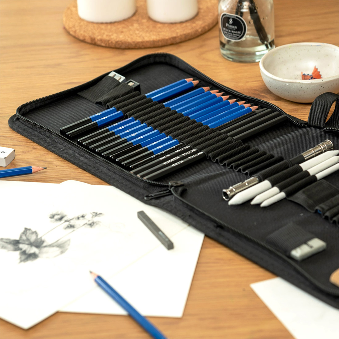 - RÓŻNORODNE OŁÓWKI – ołówki zawarte w zestawie, zarówno grafitowe, jak i węglowe, wyróżniają się wysokiej jakości rdzeniami, które umożliwiają osiągnięcie precyzji i realizmu w tworzonych pracach. Niezależnie od tego, czy potrzebujesz delikatnych, miękkich linii, czy wyrazistych, twardych konturów, zestaw ten zapewnia narzędzia, które sprostają każdemu artystycznemu wyzwaniu.