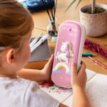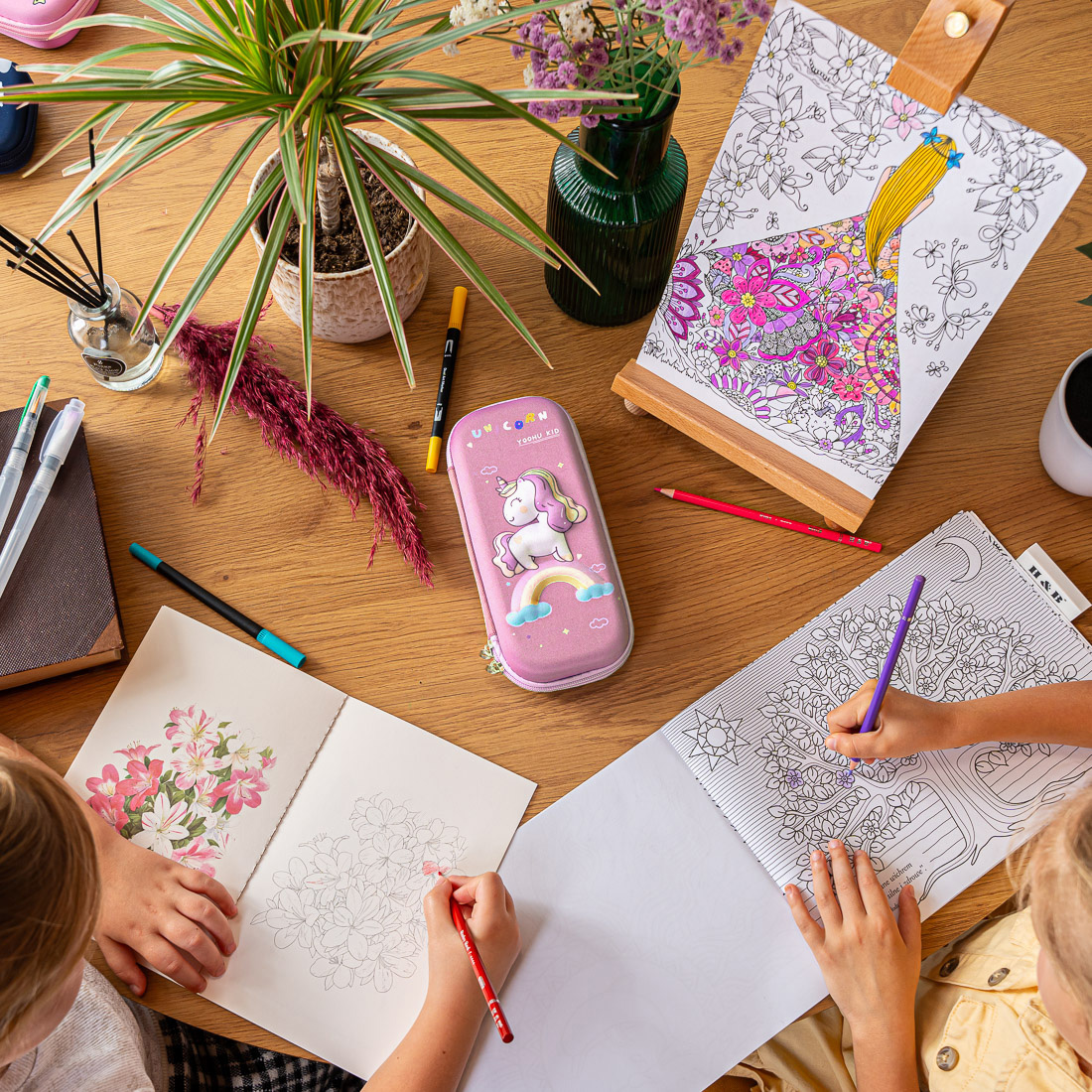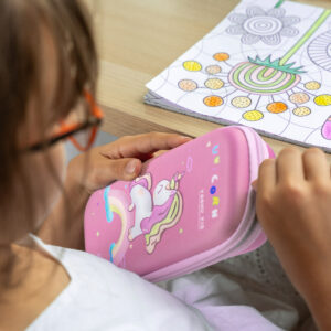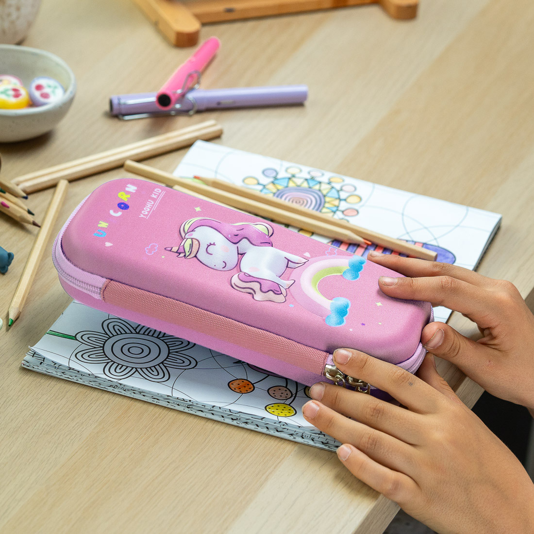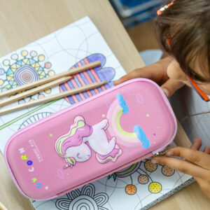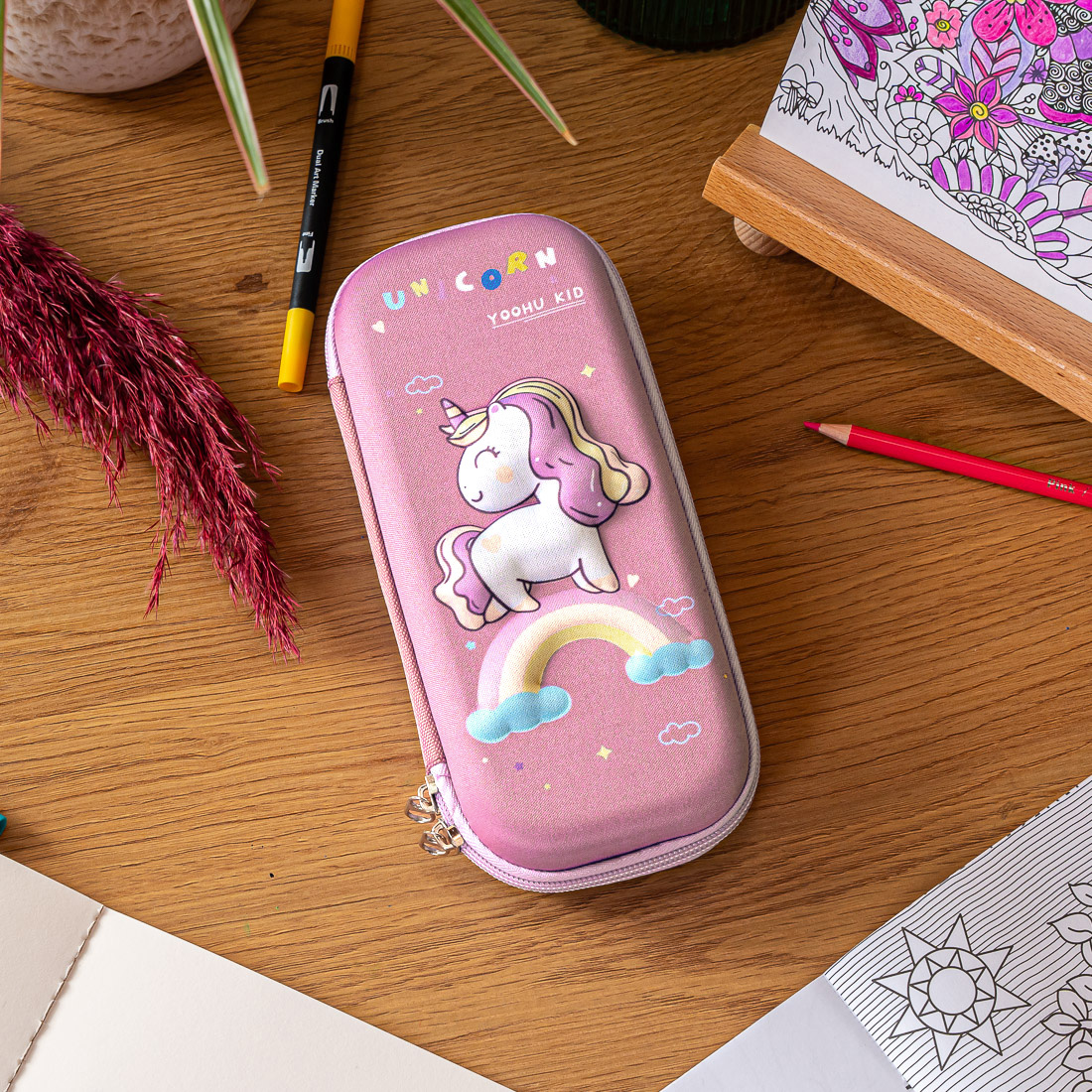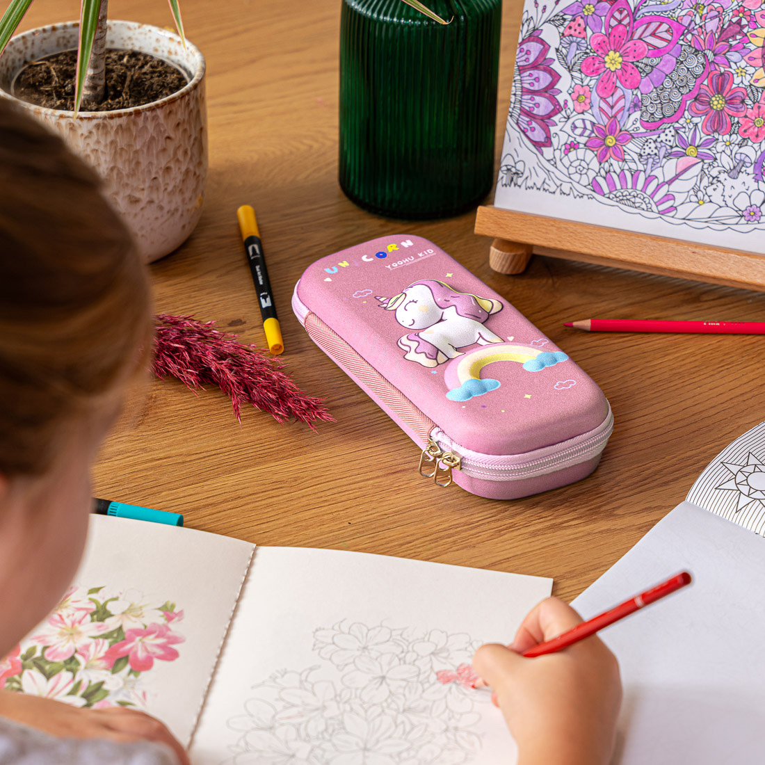 Pojemny piórnik z uroczym motywem 3D jednorożca to idealne miejsce do przechowywania kredkow, długopisów i pisaków dla każdej młodej artystki.