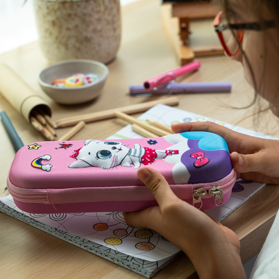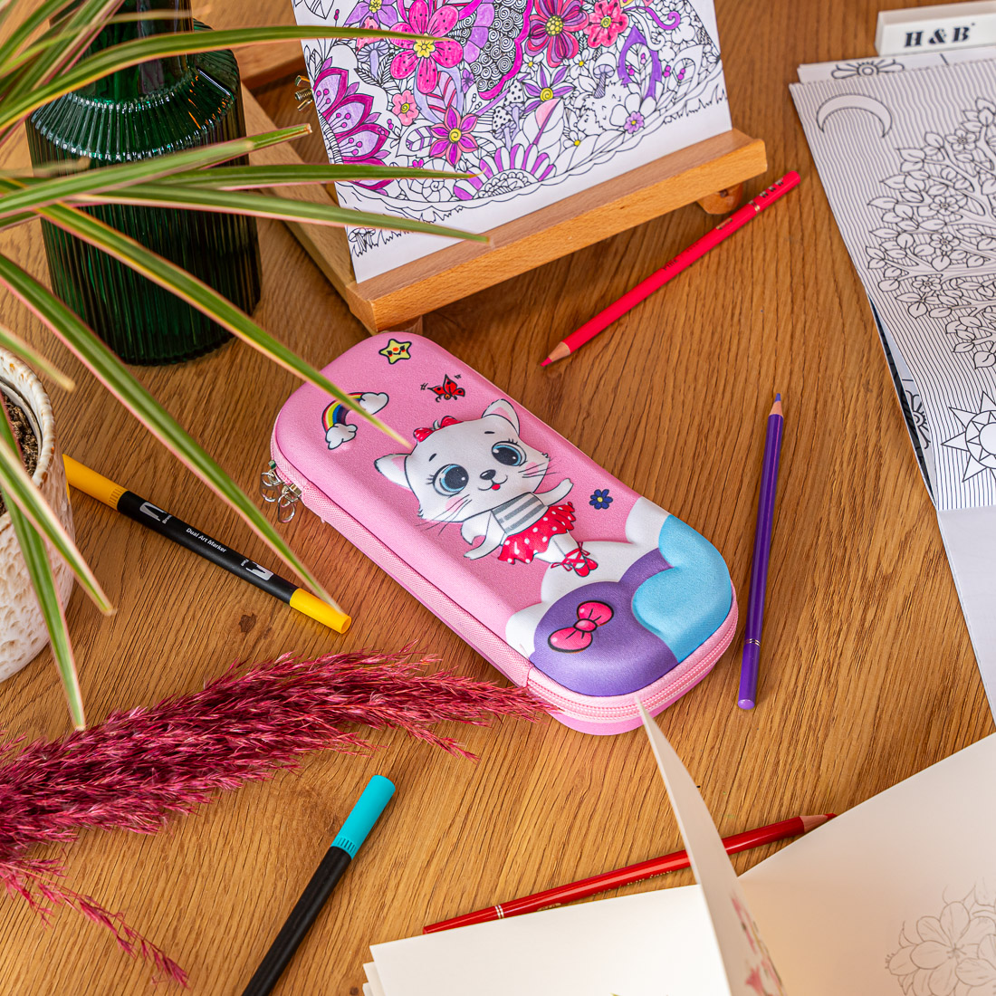 Piórnik z jedną komorą, trójwymiarowym kotkiem, to wyjątkowo praktyczne rozwiązanie do przechowywania kredek, długopisów i zestawu do szkicowania. Doskonały do użytku w pracy, szkole czy w domu.