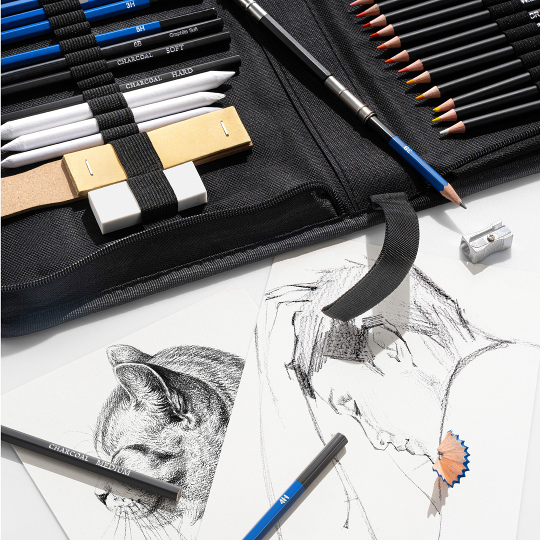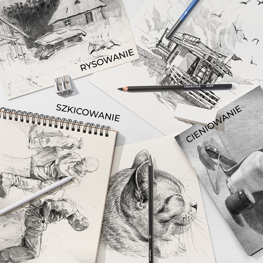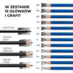 Pełen zestaw ołówków grafitowych oraz węgla to kompletny warsztat do pracy z linią, formą i cieniem, idealny do: