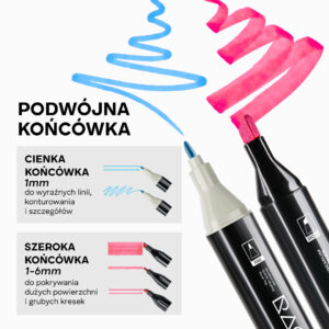 • Dwie Końcówki – jedna o grubości 3 mm, idealna do precyzyjnych linii i detali, oraz druga o grubości 6 mm, doskonała do pokrywania większych powierzchni i tworzenia dynamicznych linii. Siła nacisku i kąt nachylenia markera dwustronnego decyduje o intensywności koloru i grubości linii.