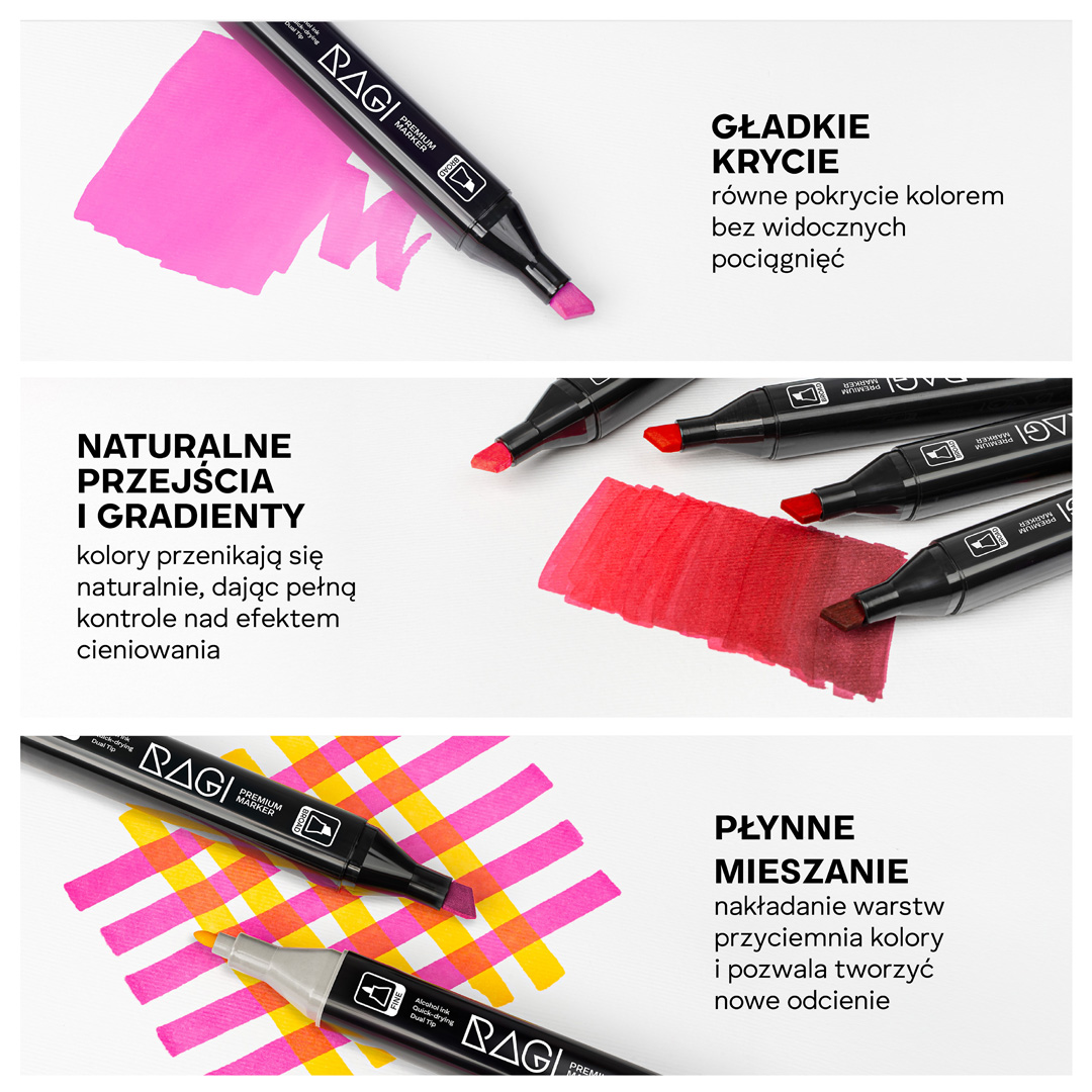 • Jakość Premium – końcówki markerów nie rozwarstwiają się i nie oddzielają. W przypadku najechania końcówką na inny kolor konstrukcja pozwala na wyczyszczenie jej poprzez wykonanie kilku pociągnięć po kartce na brudno. Dodatkowo, dzięki formule alkoholowej tusz schnie bardzo szybko, co zapobiega rozmazywaniu.