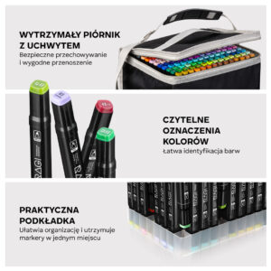 • Wygodne Etui z zamkiem błyskawicznym – wygodne etui na zestaw mazaków zapewnia łatwe przechowywanie i transport, umożliwiając utrzymanie porządku oraz szybki dostęp do potrzebnych kolorów. Organizer na markery z funkcjonalnym paskiem gwarantuje również wygodę użytkowania w dowolnym miejscu.