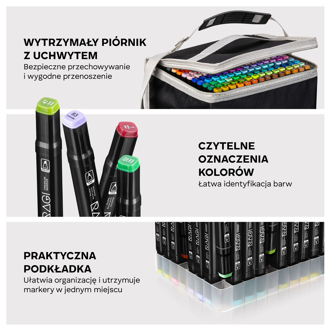 Zestaw 168 markerów alkoholowych z dwoma końcówkami, oferujący bogactwo odcieni i kolorów, przeznaczonych zarówno dla dorosłych, jak i dzieci. Pisaki artystyczne są umieszczone w praktycznym etui wykonanym z miękkiego materiału i zawierają podstawkę ułatwiającą organizację kolorów.