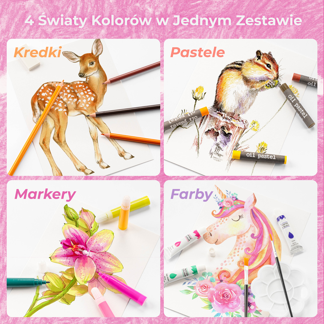 - KOMPLETNY – można tworzyć prace w dowolnej technice, dzięki kredkom, farbom czy flamastrom. To kompletna wyprawka do przedszkola i szkoły, jeśli chodzi o przybory do rysowania i malowania.