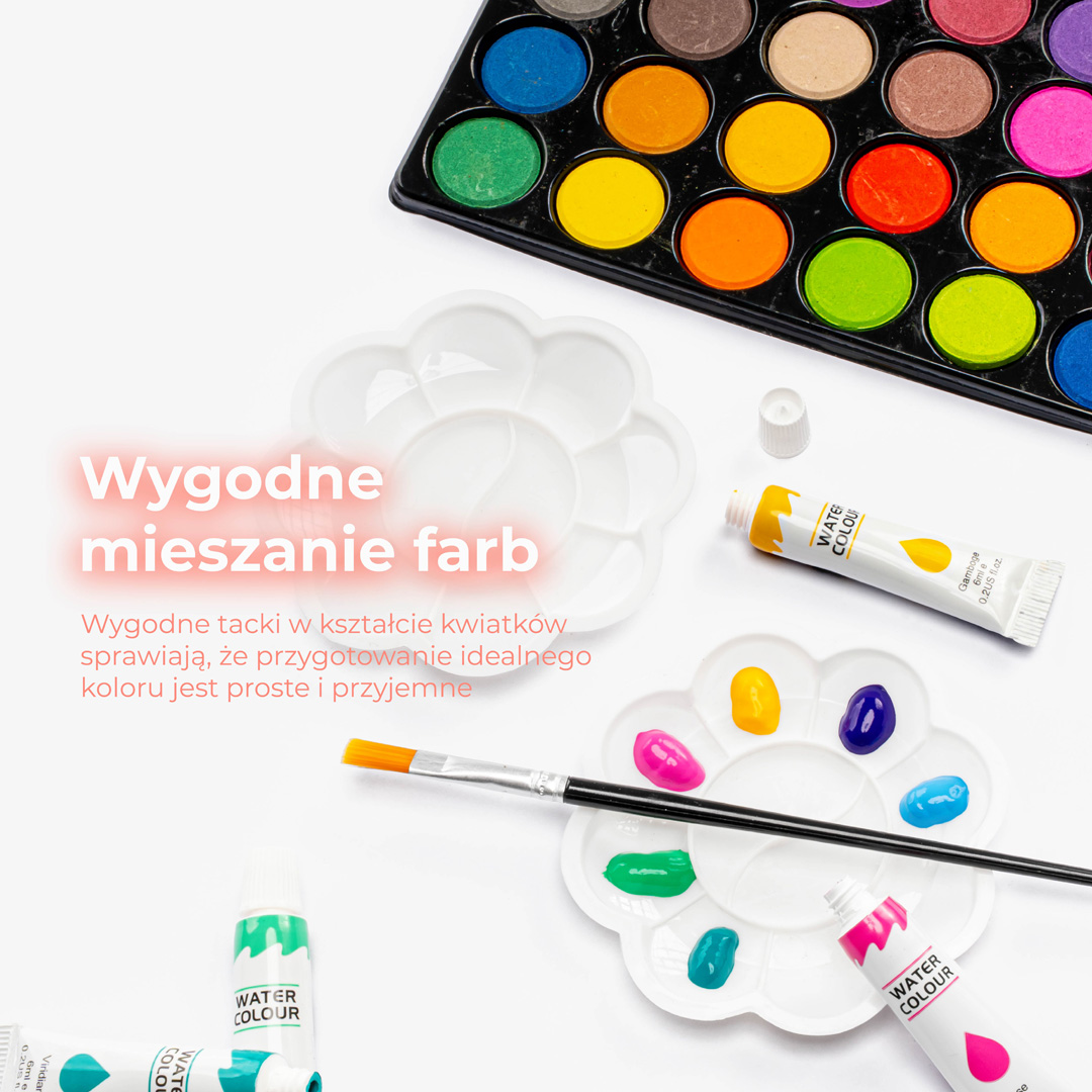 - RÓŻNORODNY – walizka z przyborami do malowania to wszystko, czego potrzebuje każdy początkujący artysta. Mnogość produktów zachęci do odkrywania swoich umiejętności.