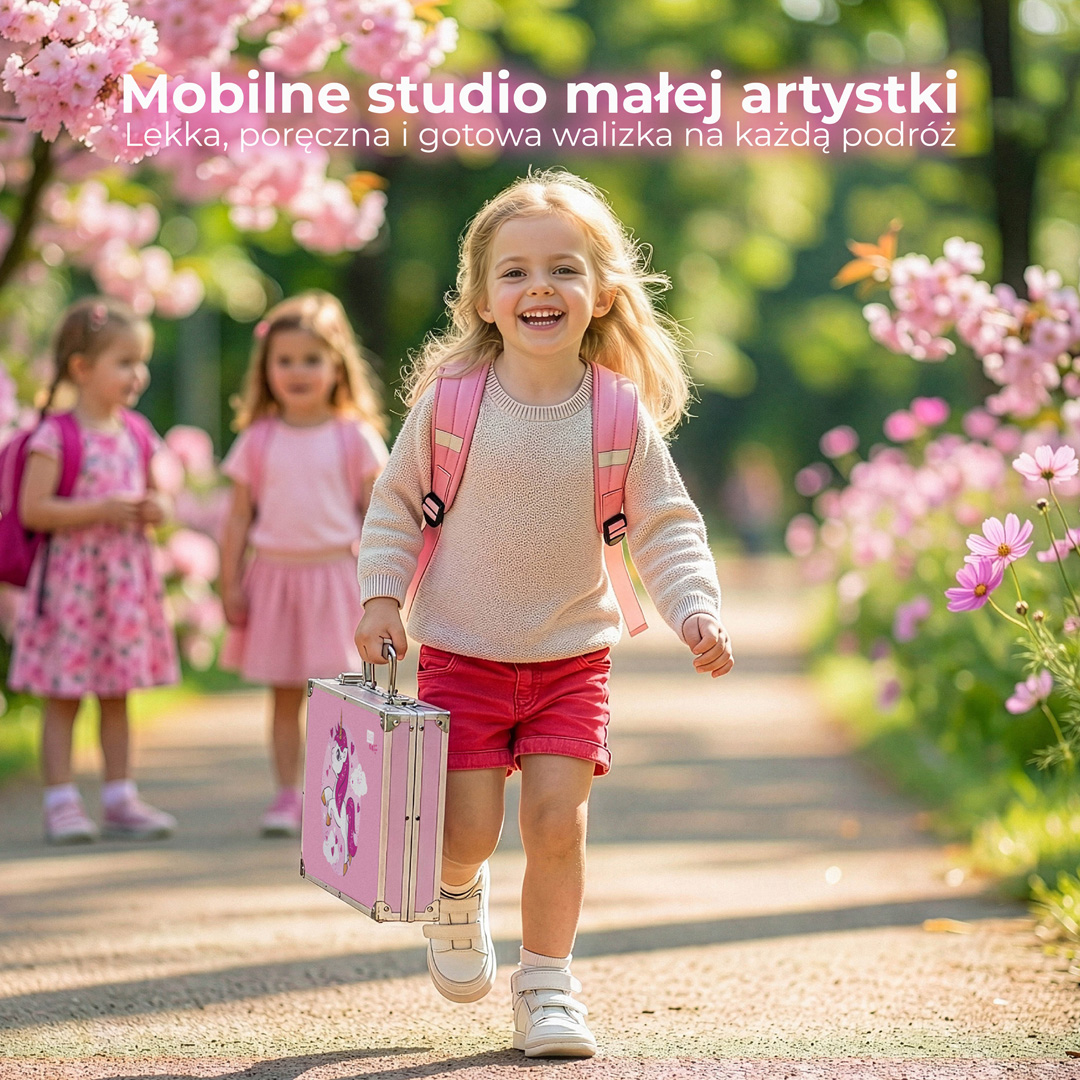 - ŁATWY W PRZENOSZENIU – cały zestaw artystyczny zapakowany w lekkiej walizce z uchwytem pozwala na wygodny transport. Dziecko może zabrać ją ze sobą niemal wszędzie: do cioci na weekend, na wycieczkę czy do szkoły.
