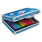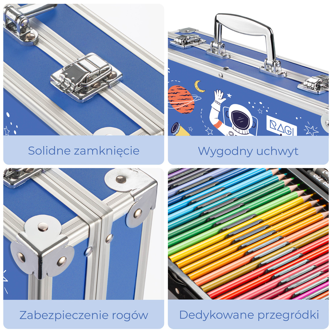 - Wytrzymała i Trwała Walizka – walizka zapewnia wyjątkową trwałość i ochronę. Metalowe brzegi wzmacniają całą strukturę walizki, chroniąc ją przed uszkodzeniami mechanicznymi. Dodatkowo, walizka wyposażona jest w mocne klamry, które skutecznie zabezpieczają zawartość przed wypadnięciem. Dzięki temu, niezależnie od tego, czy dziecko zabierze zestaw artystyczny do szkoły, parku, czy na wycieczkę, wszystkie materiały będą bezpieczne i gotowe do użycia.