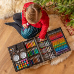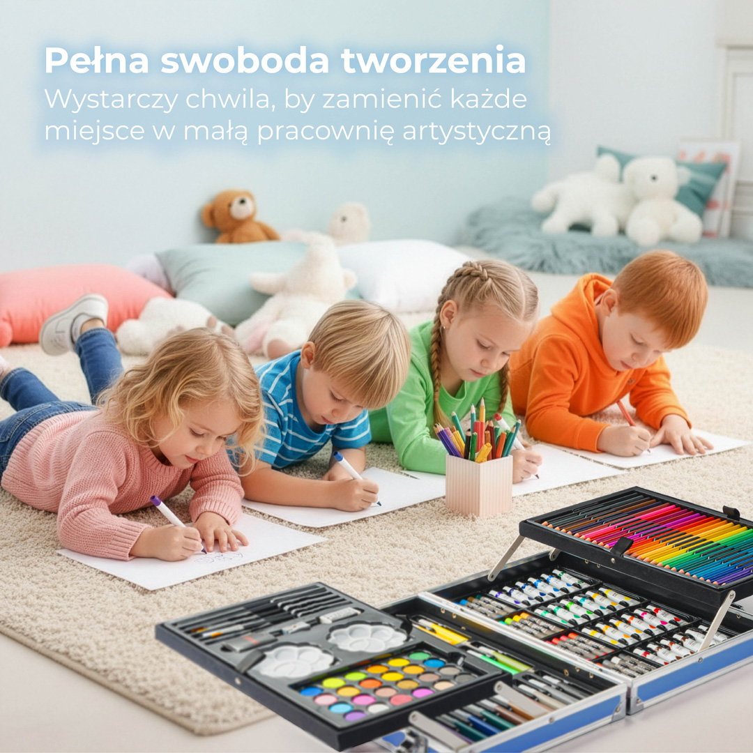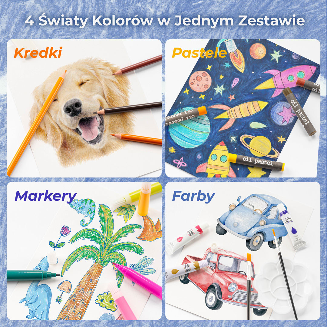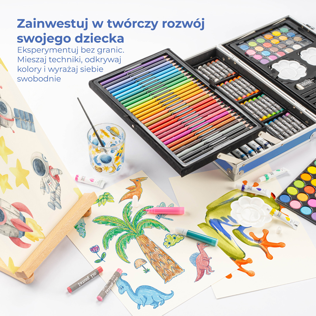 - Różnorodność Przyborów – zestaw kreatywny dla dzieci zawiera różnorodne materiały artystyczne, takie jak pastele olejne, kredki, farby akwarelowe i flamastry, co pozwala na tworzenie różnorodnych prac plastycznych. Flamastry doskonale układają się w drobnych dłoniach dzieci, co ułatwia precyzyjne rysowanie i kolorowanie. Kredki w walizce oferują szeroką paletę barw, idealną do szkicowania i rysowania obrazków. Natomiast farby pozwalają na eksperymentowanie z technikami malarskimi, rozwijając kreatywność i zdolności artystyczne dziecka. Dzięki różnorodności materiałów, mali artyści mogą swobodnie wyrażać swoje pomysły i tworzyć unikalne dzieła.