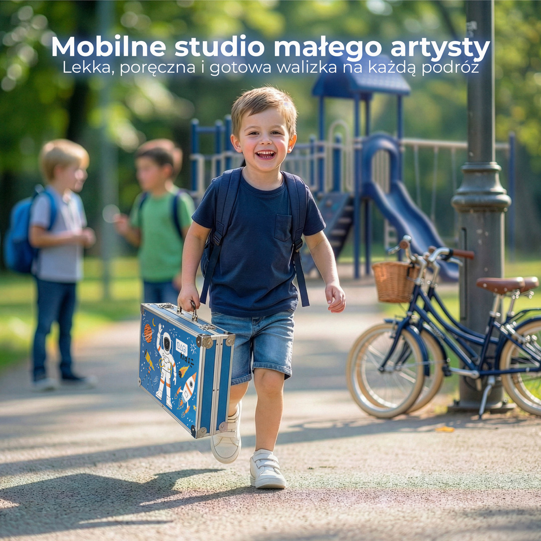 Kolorowa walizka artystyczna dla dzieci z motywem astronauty – doskonały zestaw dla małych twórców, którzy marzą o podboju kosmosu. Walizka jest nie tylko wytrzymała, ale także pełna inspirujących materiałów do tworzenia. Dzięki rozsuwanym przegrodom, każdy element jest zawsze na swoim miejscu, gotowy do użycia.