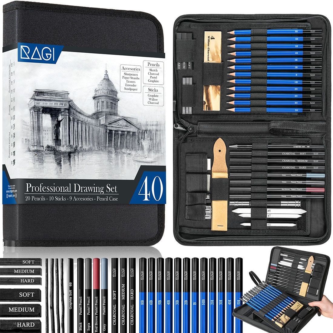 Zestaw Ołówków do Szkicowania Rysowania Profesjonalny 40 Elementów Etui